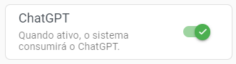 ChatGpt: Ative ou desative a interação com ChatGpt para o atendimento. Essa opção estará disponível caso a interação esteja ativa nas configurações gerais. Para saber mais, leia a seção Configurações e Canais da central de ajuda.