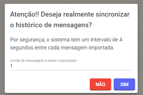 Sincronizar Histórico (Apenas para WhatsApp Web): onde é possível sincronizar mensagens antigas do dispositivo de celular, informando o limite de mensagens que serão importadas na plataforma. Somente mensagens que não estão na plataforma, serão importadas.