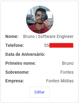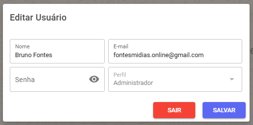 Clicando em Perfil, abrirá um pop up para editar as informações do usuário. Observe o exemplo: