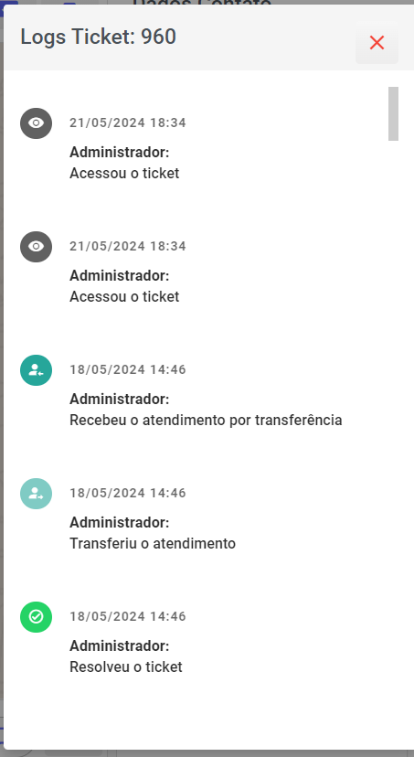 Logs e Marcar como Lido/Não Lido: com a linha do tempo de acessos que os usuários fizeram a esse atendimento. Ao lado dos logs você também pode marcar o atendimento como lido ou não lido.