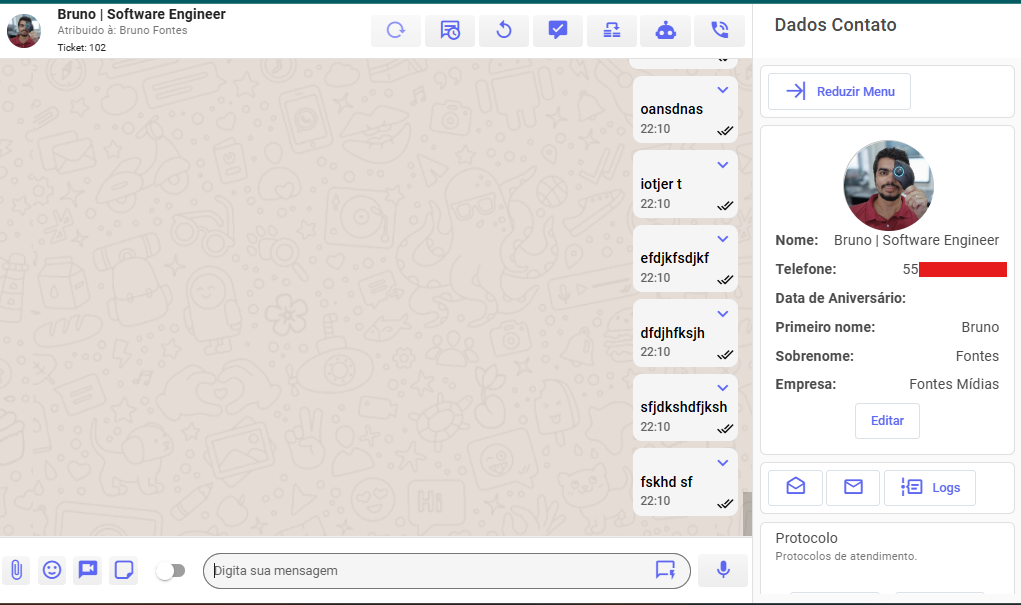 No canto direito está o menu lateral com os dados do cliente. No primeiro campo você visualiza foto, nome, número e possui a opção de editar o contato.